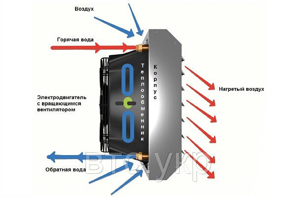 Опалення відбувається швидко та рівномірно за допомогою потужного струменя теплого повітря, що проникає в приміщення на чималу глибину за допомогою вентилятора та напрямних жалюзі.